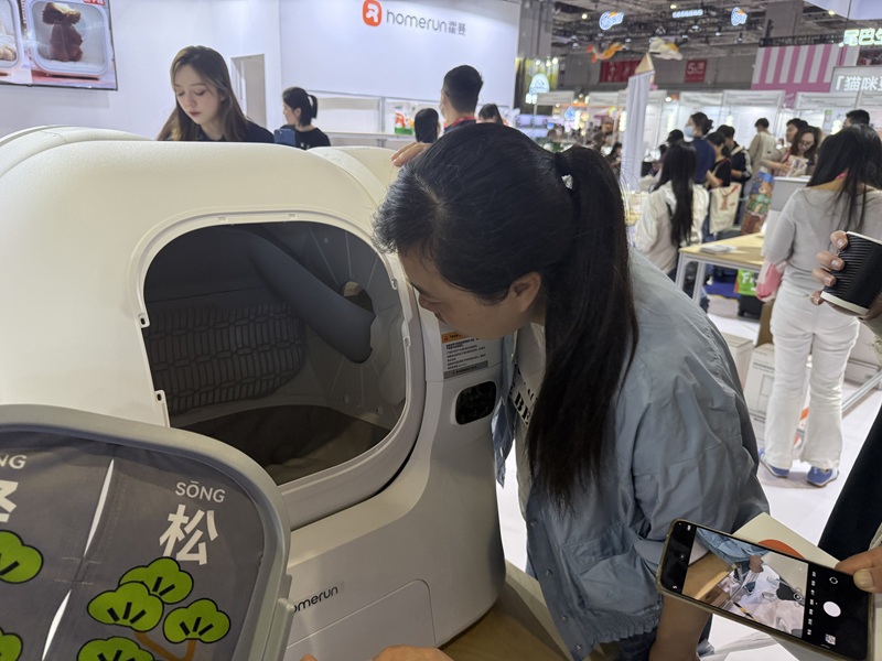 “这台宠物智能猫厕所可以说是国内在售所有同类产品中唯一一台可自动补砂,并且容量最大的猫砂盆,内里容积在106升,比普通款多了近50%。”霍曼是宠物智能电器的领导品牌,深耕宠物智能电器十年,智能猫厕所、智能喂食器、宠物空净等产品在展会现场受到热烈关注。公司技术经理唐坤表示,考虑到现在多宠家庭以及宠物主外出、追求便捷高效管理的需求痛点,团队设计了“大猫也能舒服如厕”的智能猫砂盆,右侧储砂盒容积达8L,加满一次可以使用半个月。内设的微波雷达感应和自动称重功能可有效防止猫咪被夹。霍曼也将全渠道上市该款智能猫厕所的配件,如摄像头和除臭凝胶,填补AI远程监控和除臭抑菌功能的空白。新民晚报记者了解到,目前该款猫厕所在跨境电商亚马逊等渠道均有布局,海外接受度很高。