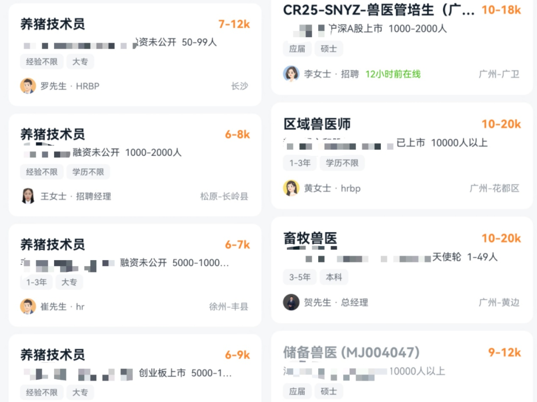 从招聘市场来看,相较于其他互联网企业对985、211高校研究生学历的普遍要求,多数养殖企业对兽医的招聘条件相对宽松,仅需相关专业背景及本科学历即可。薪资方面,养殖技术员的薪资普遍在6-8k之间,兽医的薪资水平通常可以达到10k以上,足以显示出企业对兽医人才的强性需求。