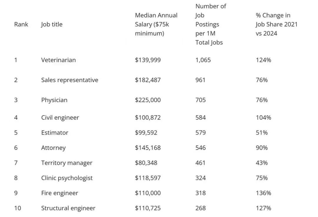 近期,美国元老级求职网站indeed发布了一份榜单,聚焦于年薪门槛不低于7.5万美元(折合人民币约54.8万元),在过去三年内职位空缺激增至少20%的高薪高需求职业。其中,兽医这一职业位居榜首,成为2025美国十大最佳高薪职业之一。